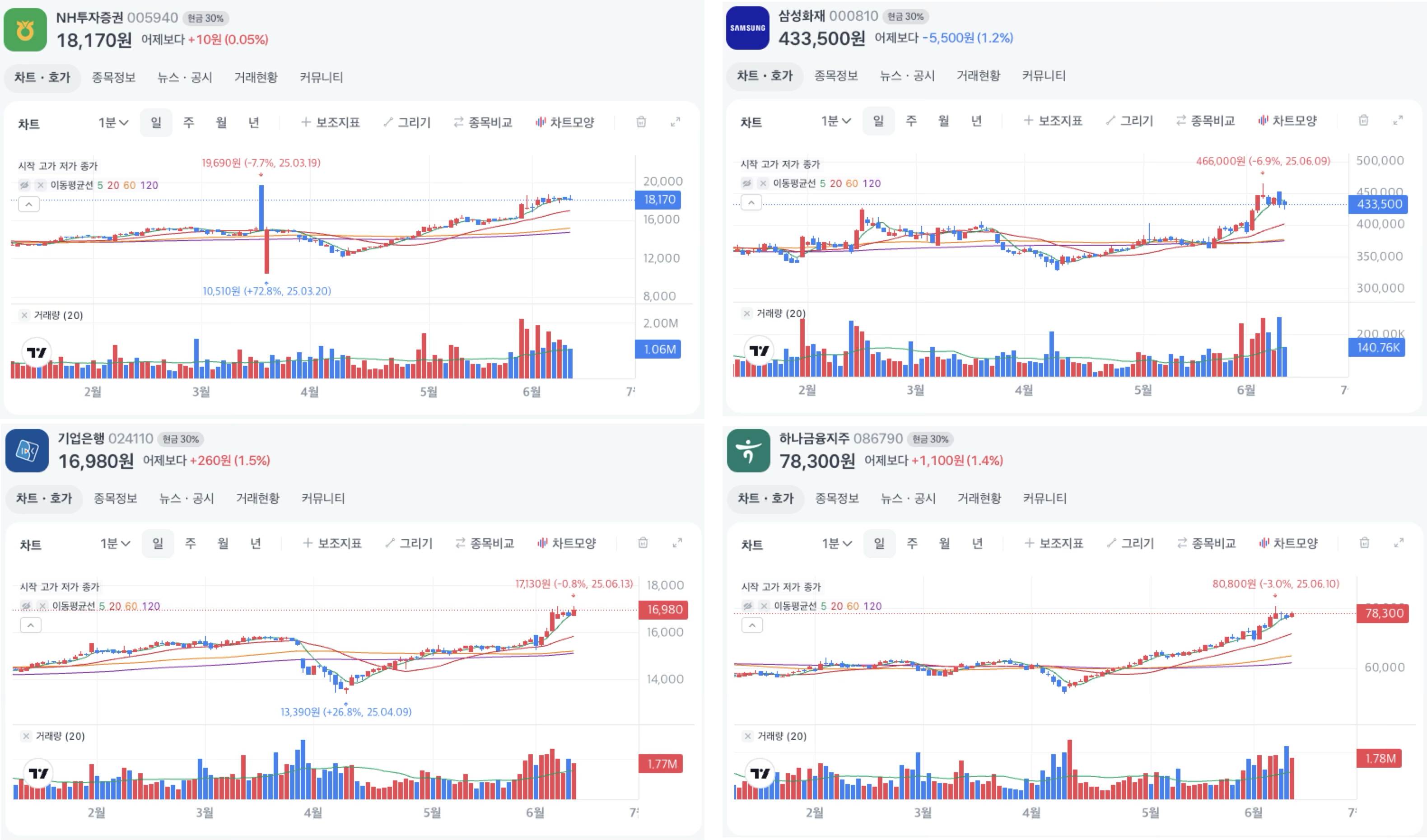 금융업종 : NH투자증권, 기업은행, 하나금융지주, 삼성화재