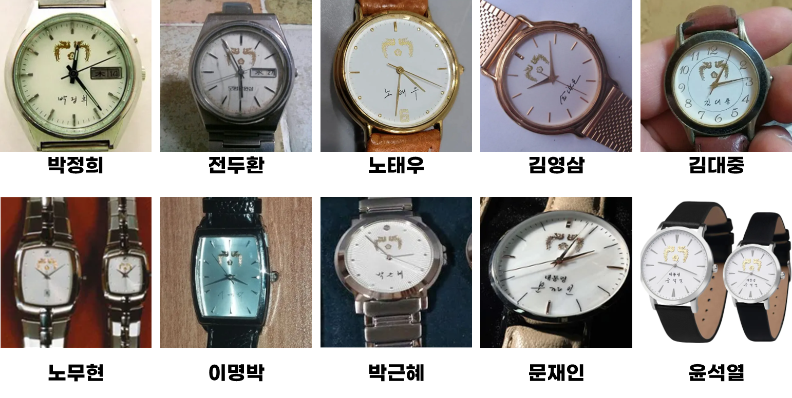 | 전두환 | 1980년대 | 쿼츠 시계, 금색/은색, 'B·H' 표기 | 중가 | 청와대 이니셜 표기 |