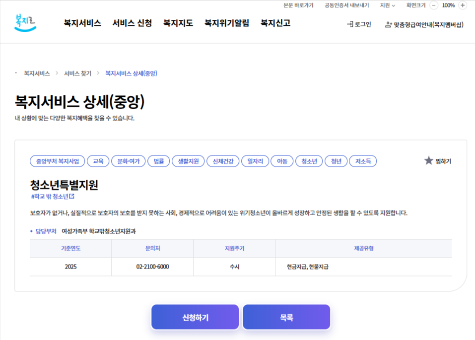 - 로그인 후 서비스 신청 → 복지서비스 신청 → 복지급여 신청 → 아동청소년 → 청소년 특별지원 순으로 신청