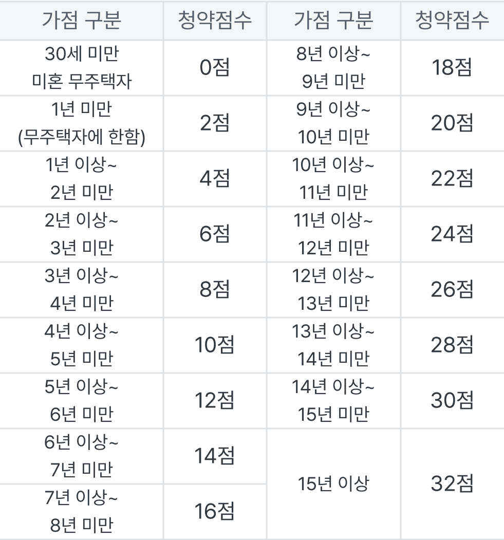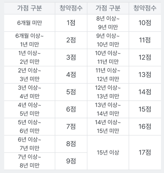 - 만 19세부터 계산하며, 무주택 기간이 길수록 높은 점수를 받습니다.