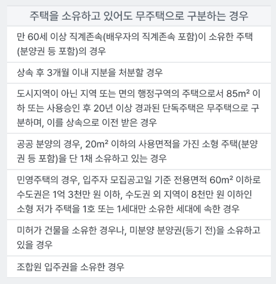 - 부모님이 주택을 소유하고 있어도 장애인 또는 고령자라면 부양가족으로 포함됩니다.