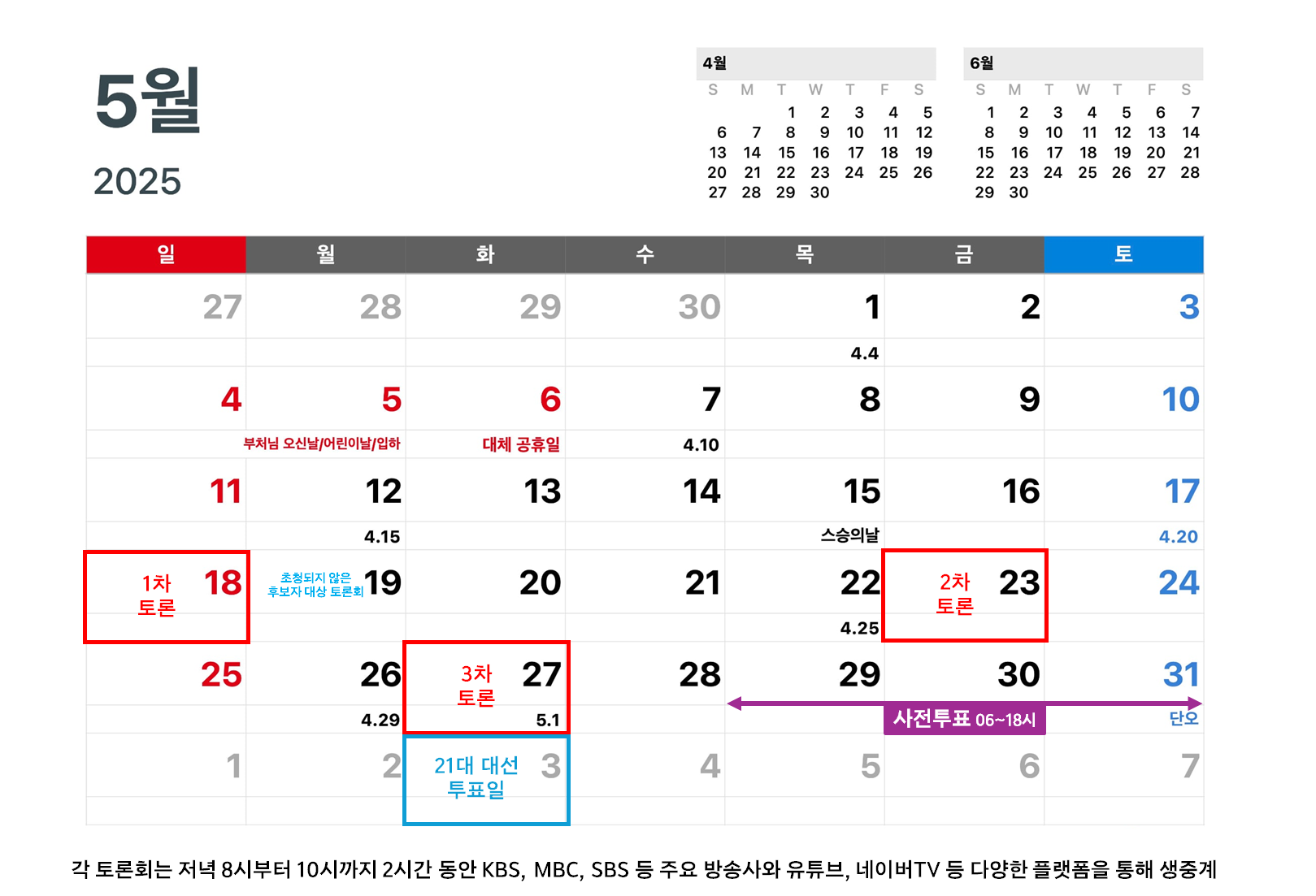 6월 3일 투표일을 앞두고 아직 중요한 일정들이 남아있어요. 특히 TV 토론은 유권자들의 선택에 큰 영향을 미칠 수 있죠! 앞으로의 주요 일정을 확인해볼게요. 🗓️