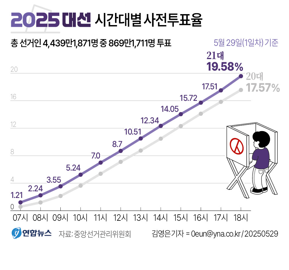 5월 29일 사전투표 첫날, 전국적으로 무려 19.58%의 투표율을 기록했어요! 이는 2022년 20대 대선 첫날 17.57%보다 2.01%포인트 높은 수치로, 사전투표가 도입된 2014년 이후 가장 높은 첫날 투표율이에요.