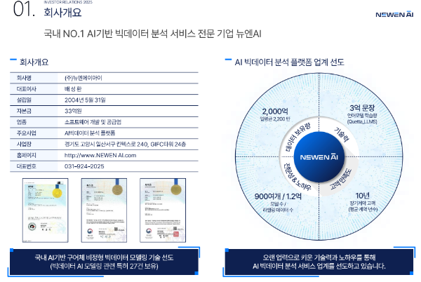뉴엔에이아이(NEWEN AI)는 2004년 설립된 생성형 인공지능 기반 빅데이터 분석 전문기업입니다.